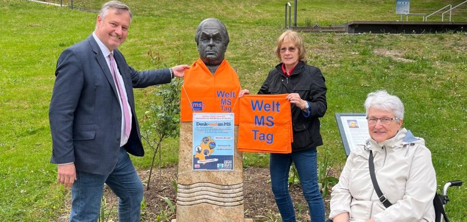 Bildverweis: Bürgermeister und Kurdirektor Markus Oberndörfer und die Mitgliederinnen des MS Stammtisches Rheingau-Taunus-Wiesbaden Christel Grosch und Ilona Konrad || © Stadt Bad Schwalbach