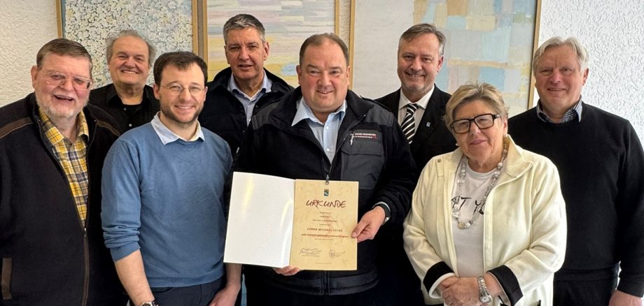Bildverweis: Der Magistrat bei der Urkundenübergabe an Michael Lecke (Mitte). || © Stadt Bad Schwalbach
