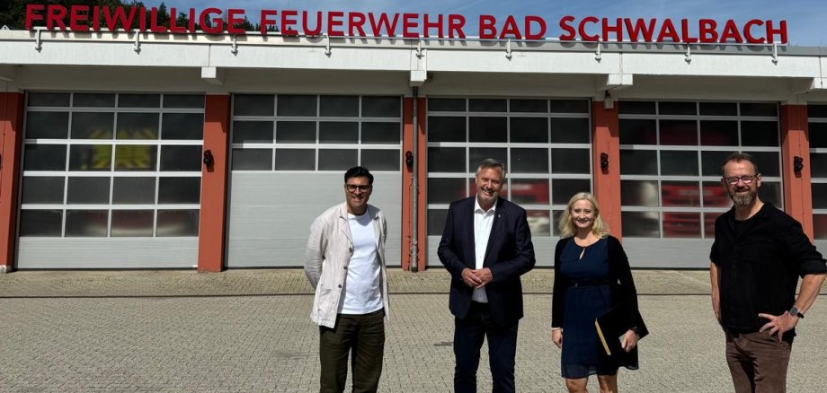 Bildverweis: Bürgermeister und Kurdirektor Markus Oberndörfer (2. von links) und Bauamtsleitung Katrin Boller bei einer Begehung mit dem Architektenbüro Zaeske, vertreten durch Luigi Pennella (links) und Sven Burghardt, am 25.08.2025. || © Stadt Bad Schwalbach