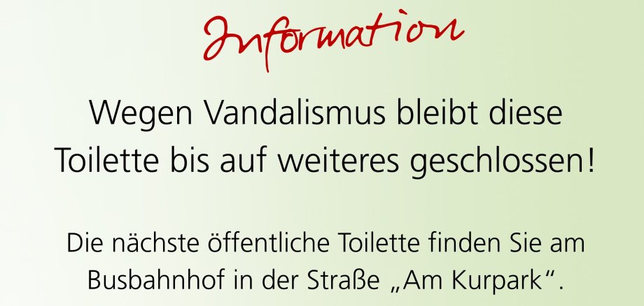 Da zunächst eine Begutachtung der Schäden durch Fachfirmen erfolgen muss, lässt sich die Dauer der Reparatur nicht abschätzen. Um den Besucherinnen und Besuchern des Kurparks dennoch eine sanitäre Möglichkeit zur Verfügung zu stellen, wird vorübergehend eine mobile Toilette aufgestellt.
