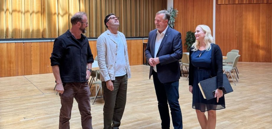 Bildverweis: Bürgermeister und Kurdirektor Markus Oberndörfer (2. von rechts) und Bauamtsleitung Katrin Boller bei einer Begehung mit dem Architektenbüro Zaeske, vertreten durch Sven Burghardt (links) und Luigi Pennella, am 25.08.2025. || © Stadt Bad Schwalbach